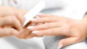 A manicure consists of filing and shaping the free edge of nail, pushing and clipping (with a cuticle pusher and cuticle nippers) any nonliving tissue ( but limited to the cuticle and hangnails) treatment with various liquids, massage of hand.